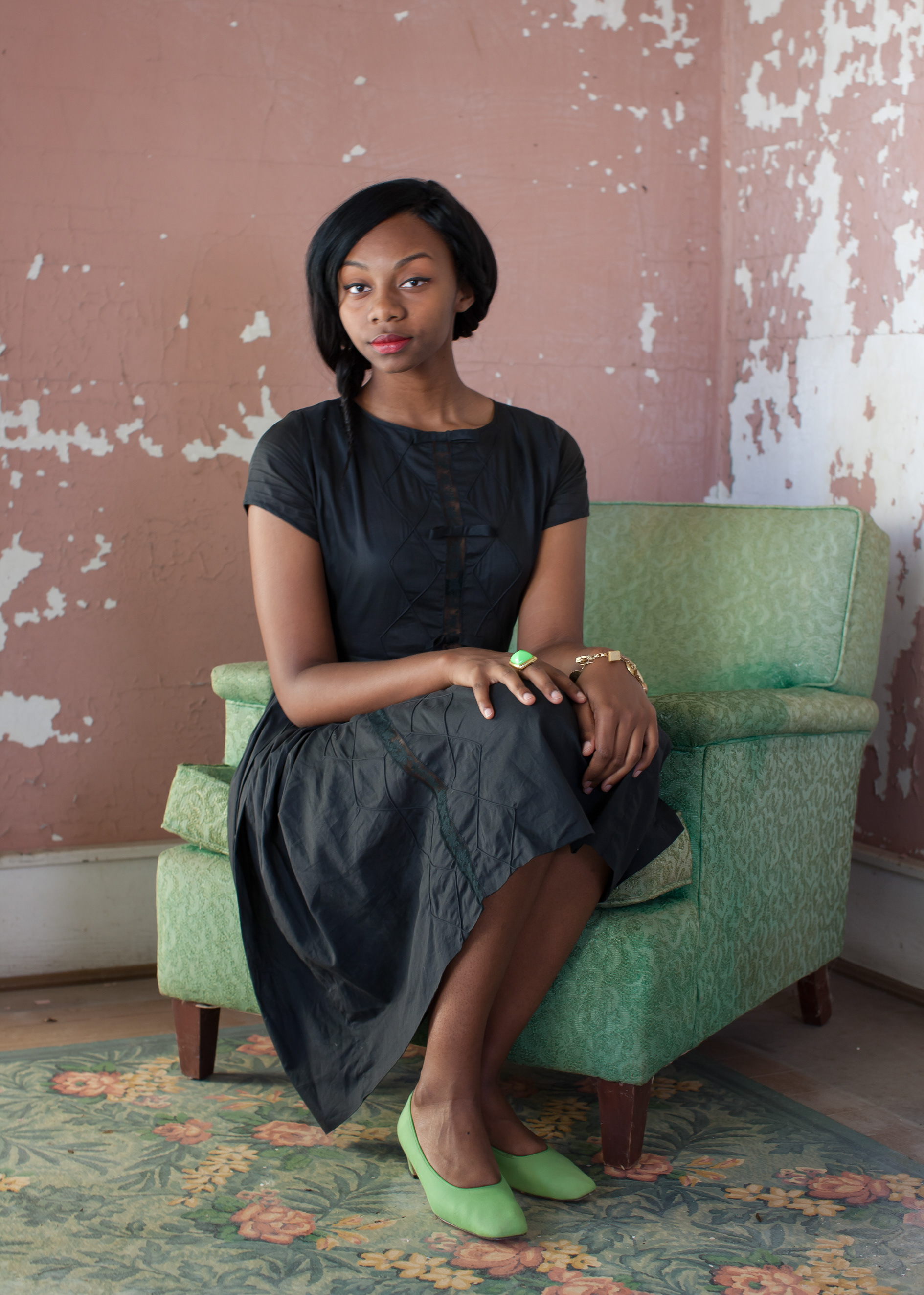 This portrait series explores role reversal. I've placed young African American women in staged southern settings wearing vintage dresses I discovered in small town thrift shops in North Carolina and Virginia. They inhabit an imagined, exclusive world that would have been inaccessible to rural women of color during that era. The dresses serve as symbols—of coming-of-age, of constrained femininity and the sisterhood of social manners pulled from the musty pages of Emily Post.