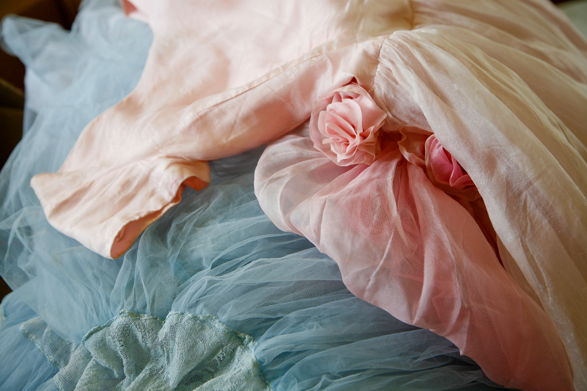 Pink and Blue Prom Dresses found at auction lay in wait in my dining room, The D.A. Barnes House, Murfreesboro, North Carolina, 2014 / Magnolia, Nashville, Tennessee, 2008
