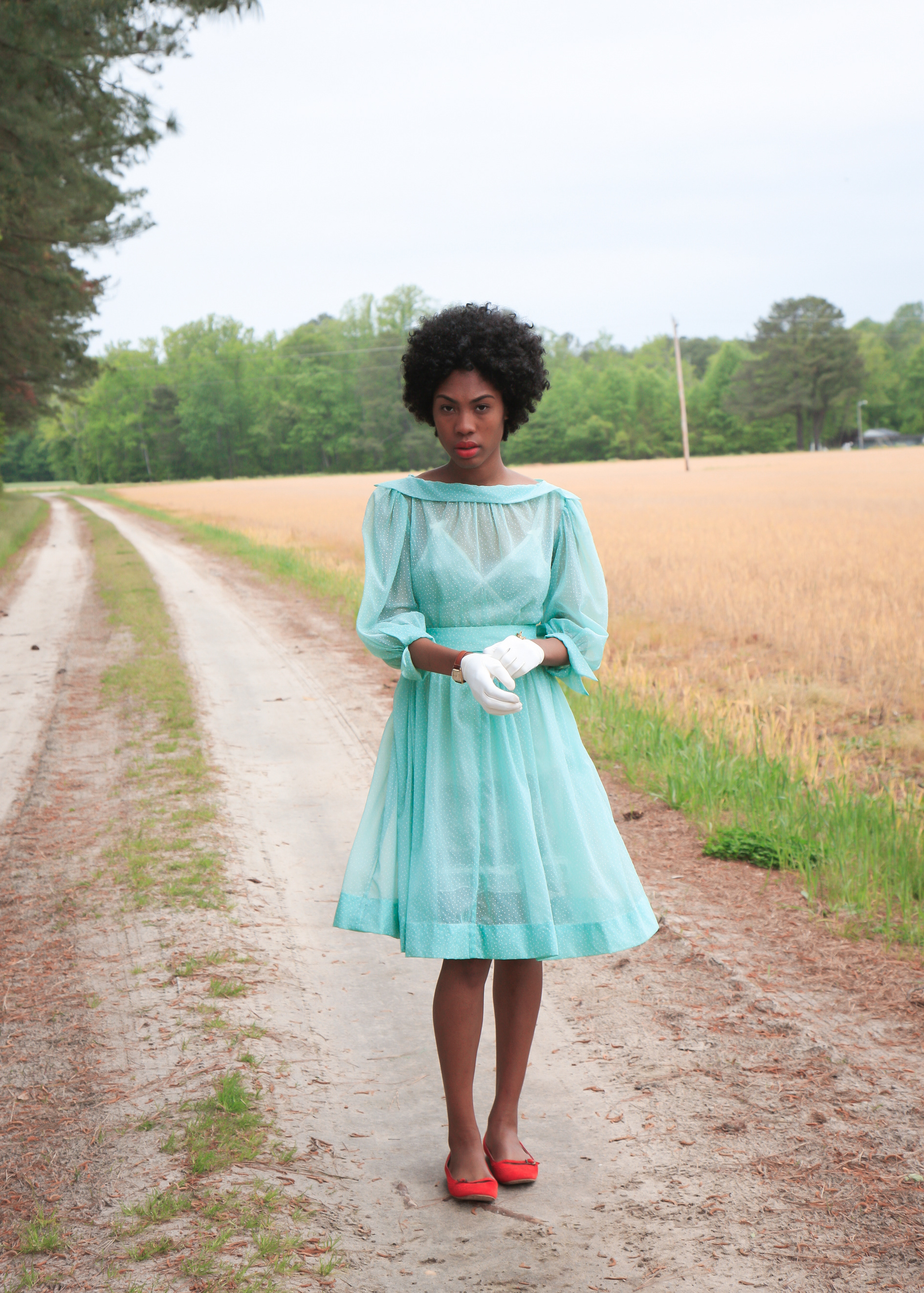 There is a debutant in white crinoline waiting for her suitor on a porch swing; a 1950s model in a fitted black cocktail dress wearing lime green Jackie O square heels; a wealthy socialite in her electric orange fortrell skirt-suit adorned with diamonds and pearls; and a young woman in her Sunday best a mint green dotted swiss dress, slipping off her white gloves as she walks the driveway of her father's antebellum plantation.